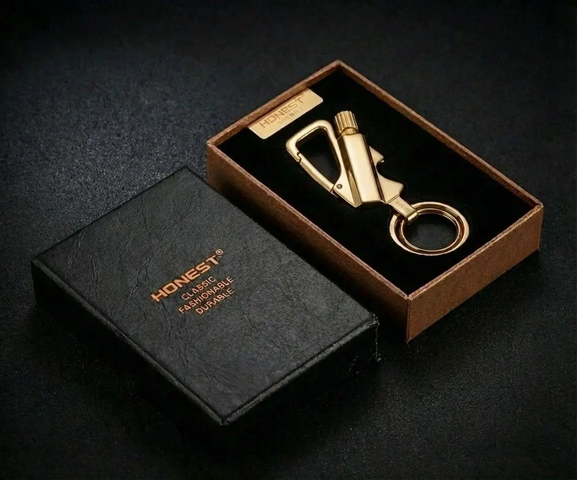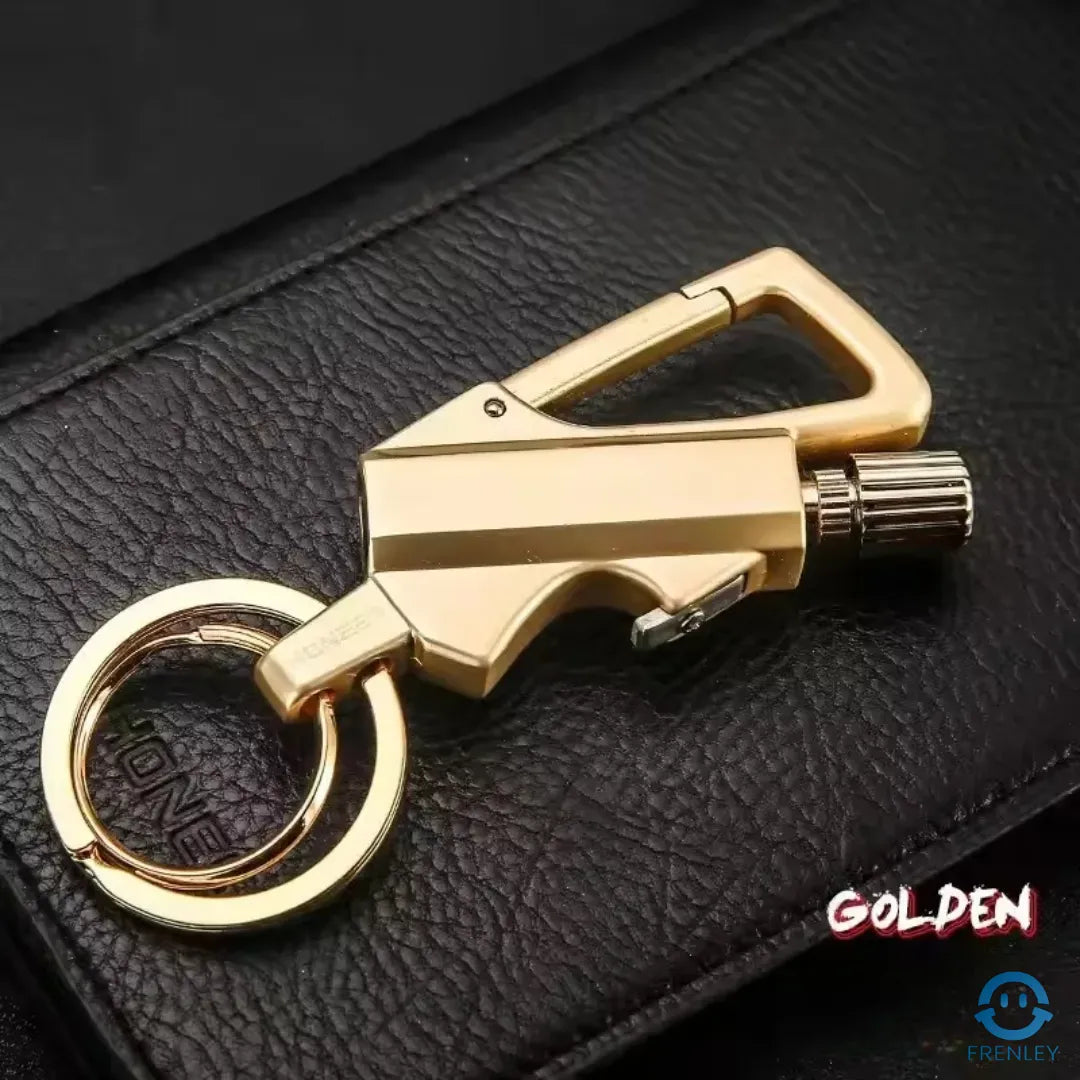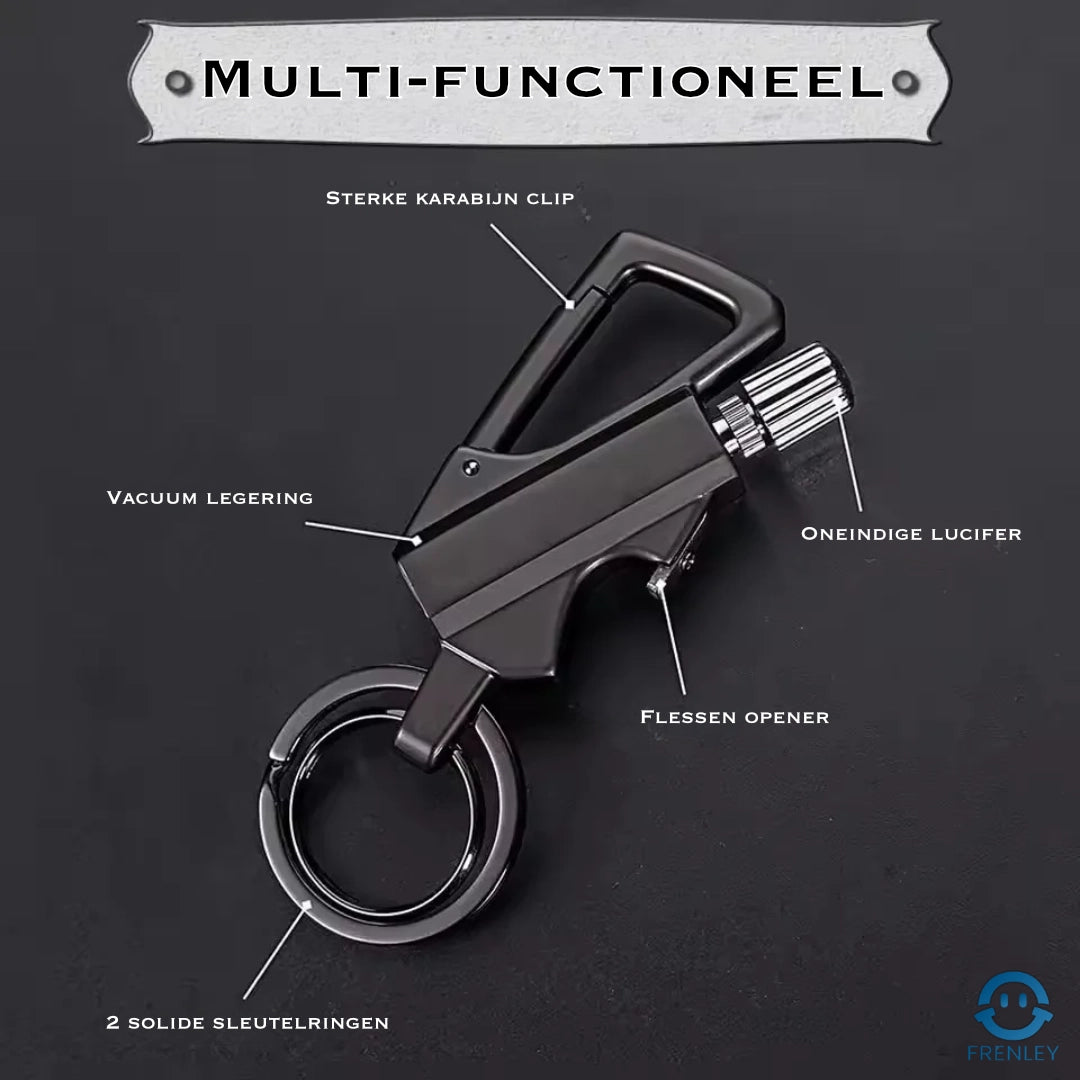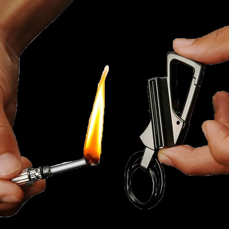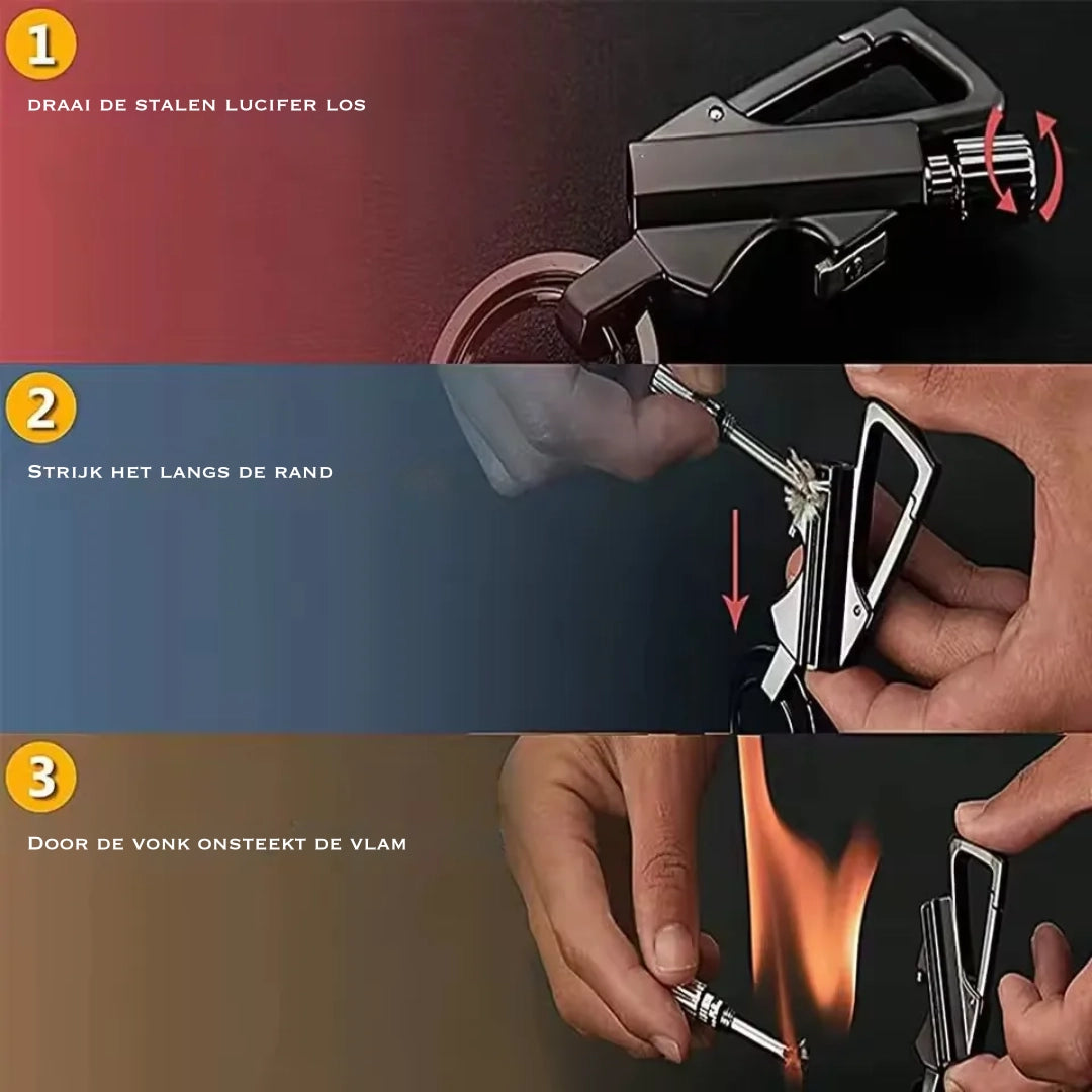 Herbruikbare sleutelhanger-aansteker met premium magnesium kern en behuizing van zinklegering, inclusief sleutelring. Multifunctioneel met karabijnhaak en opener.