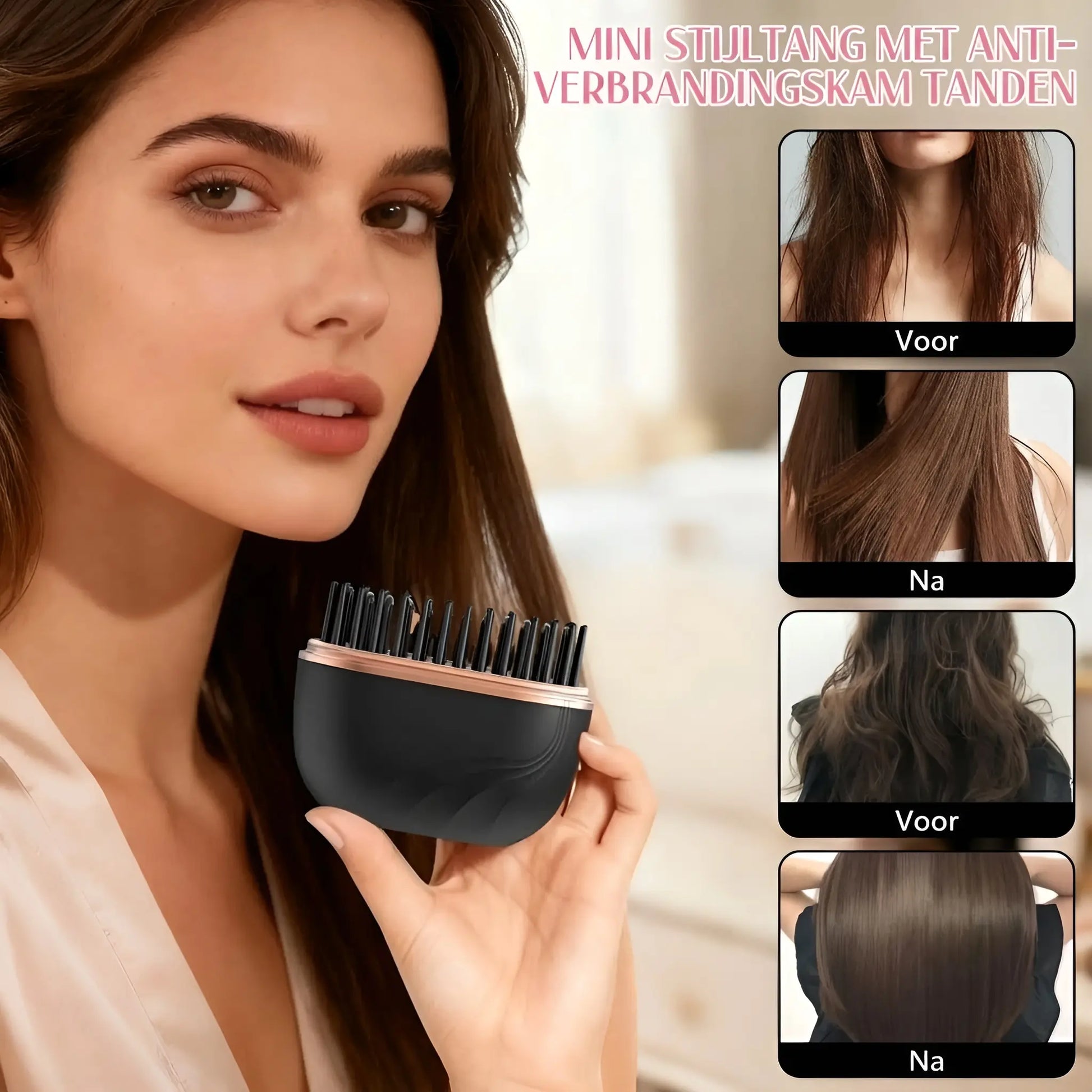 Met de SilkShield™ Pocket 2025 Draadloze Mini Stijlborstel heb je altijd een snelle stylingsoplossing bij de hand. De combinatie van drie temperatuurstanden, keramische PTC-verwarming en een anti-verbrandingskam maakt het eenvoudig om je haar binnen enkele minuten glad en netjes te maken. De draadloze 2000 mAh accu met USB-C opladen en de meegeleverde beschermhoes zorgen ervoor dat je de stijlkam overal veilig mee naartoe neemt. Ideaal voor onderweg, op kantoor of op reis. Bestel de SilkShield Pocket 2025 bij Frenley en upgrade je haarroutine met een compact, modern stylingtool.